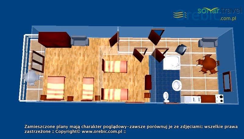 Apartament z dwiema osobnymi sypialniami, w jednej łóżko małżeńskie i jedno pojedyncze, w drugiej dwa pojedyncze łóżka. Niewielka sofa przeznaczona dla dziecka do 10 roku życia ( 6 osoba). Dobrze prezentująca się kuchnia i łazienka.